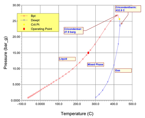 Two-stage condensate flashing: Saturated residing liquid at relieving pressure. If two distinct liquid phases are present, refer to Shell’s DEP. For example, water and condensate: take each saturated liquid separately, carry out the flashing calculation and determine which liquid would result in the higher orifice size. However, the purpose of this case study is to assess the vessel survivability. Hence, a real case with a combined saturated liquid phase will be considered with the same methodology of two-stage flashing (FIG. 4).