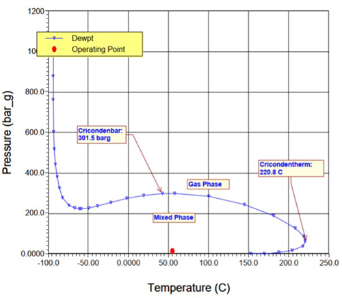 Fluid behavior and phase envelope. The test separator inlet feed stream is a mixed-phase fluid (vapor fraction: 0.95, comprising vapor, condensate and water). To further understand the fluid behavior, FIGS. 2 and 3 show the phase envelopes of the inlet feed and residing liquid, respectively.