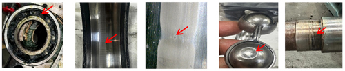 FIG. 4. (From left to right) An MDE end bearing with black grease due to stray current; an electrical fluting marking on an MDE outer race; a microscopic image showing electric arc pitting; balls with a stray current effect; and a black mark on a shaft MDE bearing seating area.