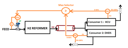 It was decided to utilize an APC for zero H2 loss to compensate for the supply-demand dynamics, such that the H2 is made available in a minimal amount of time by increasing feed to reformers should there be a sudden increase in demand. As the control matrix was not very dense and the owner-operator did not want to buy a full MPC for just one application, an ARC was chosen. FIG. 3 shows a simple yet effective demand-supply balance control scheme for the H2 header. The idea was to identify overpressure and send a signal to adjust the reformer’s feed rate gradually until zero flaring of the header was achieved, and then ramp up the reformer’s feed rate gradually if more H2 was needed.