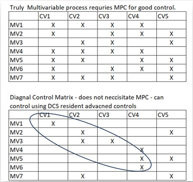 To simplify the decision, a control matrix can be developed by listing CV in a row and MV in a column; start marking if an interaction exists between the CV and corresponding MV, as shown in FIG. 2. If the control matrix developed in this way is dense, then the process is truly multivariable, and an MPC is necessary. If the control matrix is diagonal, as marked in FIG. 2, then the process is not truly multivariable. A binary distillation or furnace firing controls and a DCS-based advanced control scheme will suffice.