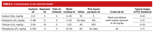 Catalyst inventory. As mentioned above, bio-derived feedstocks will introduce known or new catalyst poisons and inhibitors into the FCCU. These contaminants include alkali and alkaline earth elements and phosphorus (TABLE 2).