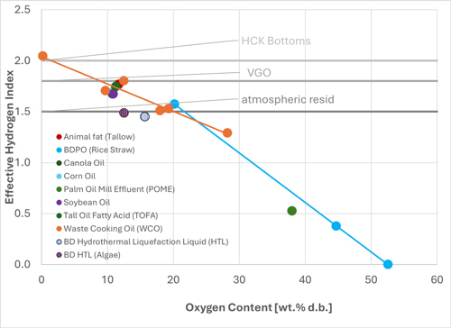 FIG. 2. EHI3 vs. feed oxygen content of a selection of different bio-derived feeds.