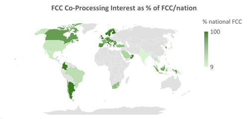 FIG. 1. The authors’ company’s visibility of interest in FCC coprocessing in percentage of FCCUs per nation.