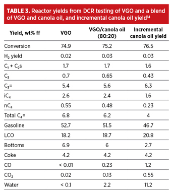 TABLE 3 summarizes yield data from a DCR pilot plant study for the coprocessing of canola oil, with VGO as a reference fossil feed and a typical Ecat. This study showed the blending of canola oil with VGO caused a slightly higher propylene yield, slightly lower C4= and gasoline yield, higher LCO yield and a significantly lower bottoms yield. As expected, COx and water yield increased with canola oil content.