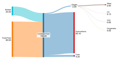 The yield structure impact of coprocessing bio-derived feed streams cannot be generalized apart from the increased yields of water, CO and CO2. As such, the amount of the biofeed coprocessed contributes to the sellable product pool based on the rate minus oxygen in feed, coke and dry gas yields. Some biogenic carbon is lost from the product pool via the conversion of oxygen to CO and CO2. With lipidic feedstocks, nearly all oxygen is converted to water and carbon oxides (COx) (CO and CO2), and the product distribution is about 80:10:10 for water, CO and CO2, respectively, with trace levels of oxygenate byproducts present in liquefied petroleum gas (LPG), cracked naphtha and heavier liquid streams.
