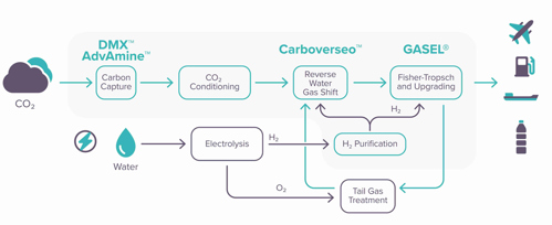 - Norske eFuel: This is Norway’s first industrial scale eFuel facility.5 The project will use the advanced RWGSb,e process to convert CO2 to CO for F-Tc,d conversion and downstream upgrading units. Also, extensive integration of all processing schemes minimizes the facility’s footprint. The eFuel plant will produce 1,000 barrels per stream day (bpsd) of liquid product from biogenic CO2. Using renewable electricity for energy needs, the finished products meet eFuel submandates of the European regulation, ReFuelEU.6
