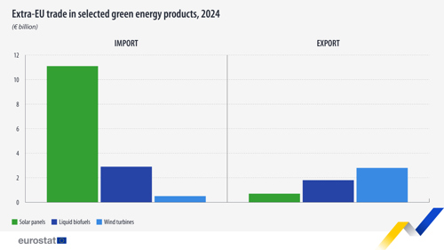 In 2024, the EU imported €11.1 billion worth of solar panels, €2.9 billion of liquid biofuels, and €0.5 billion worth of wind turbines from extra-EU countries, totaling almost €14.6 billion in imports of green energy products.