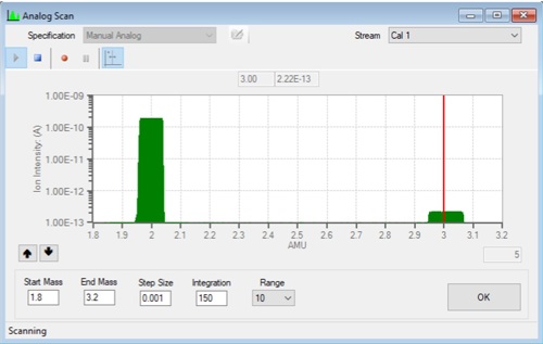 Magnetic sector MS, operating in dual-resolution mode, can resolve these low-mass ions with exceptional accuracy. The system employs separate high and low resolving slits in front of the detector, automatically switching via software control depending on mass number. Concentrations of HD near 150 ppm can be measured with a precision of ±5 ppm, sufficient to discriminate between fossil-based and renewable H2 sources. FIG. 3 shows the spectrum of a H2 sample where the HD concentration at mass 3 is approximately 1,000 ppm of the total H2 in the sample verifying correctly that this H2 is of fossil based origin.