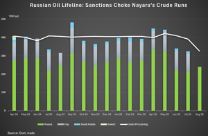 It has been forced to reduce crude runs at its 400,000-bpd Vadinar refinery to 70%–80% of capacity - it was previously running at 104% - as it struggles to find export buyers for its fuel and banks to facilitate payments, sources with knowledge of the refinery operations say.