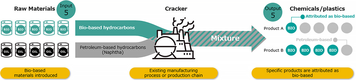 Mitsui Chemicals has been introducing bio-based hydrocarbons into its cracker at its Osaka Works (Takaishi, Osaka) and has started manufacturing and marketing plastics and chemicals using the mass balance approach since December 2021. In addition, Mitsui Chemicals has been introducing pyrolysis oil derived from plastic waste which is procured from CFP Corp. into its cracker and has begun manufacturing and marketing chemically recycled plastics and chemicals using the mass balance approach since March 2024.