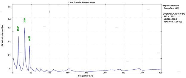 Looking at FIG. 3, it is evident why high vibration exceeding acceptable limits was seen at the site. Vibration measurements are normal during a motor solo run in a workshop—this is because the measured motor bearing housing natural frequency of 32 Hz is close to the motor running speed of 30 Hz, leading to “structural resonance.”