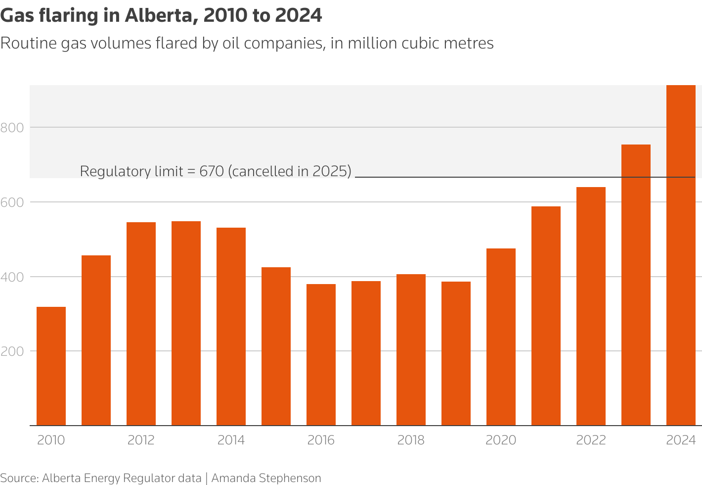 But regulatory data shows flaring has been rising in Alberta. Oil and gas producers in the province flared approximately 912.7 MMm3 of natural gas in 2024, exceeding the annual provincial limit by 36%.