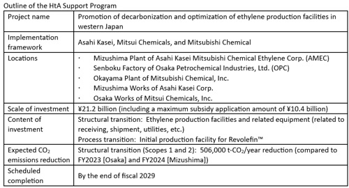 Asahi Kasei, Mitsui Chemicals and Mitsubishi Chemical have explored measures to promote decarbonization and optimize production capacity for their two ethylene manufacturing facilities in western Japan. To achieve these goals, the three companies applied for and were selected for the “Fiscal 2025 Support Program for Energy and Manufacturing Process Conversion in Hard-to-Abate Industries” (HtA Support Program) by the Ministry of Economy, Trade and Industry (METI) to promote initiatives such as the use of biomass feedstock as an alternative to petroleum-derived resources.