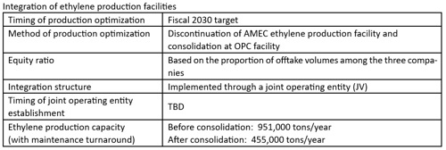 The three companies have signed a basic agreement to establish a new joint operating entity for the two ethylene production facilities in western Japan, and to subsequently discontinue operations of the Asahi Kasei Mitsubishi Chemical Ethylene Corp. (AMEC) ethylene production facility of its Mizushima Plant in Kurashiki, Okayama Prefecture, and consolidate operations at the Osaka Petrochemical Industries, Ltd. (OPC) facility in Takaishi, Osaka, targeting fiscal 2030.