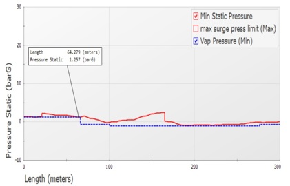 Results and discussion. Transient results depict that the maximum transient pressure and dynamic forces for this scenario are well within the maximum allowable surge limit for the entire circuit. However, there is cavitation in the system during the surge event. To identify the reason for this cavitation, the minimum surge pressure (negative pressure) profile across the system was analyzed. A graphical representation of the minimum surge pressure is shown in FIG. 3.