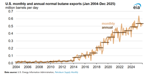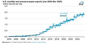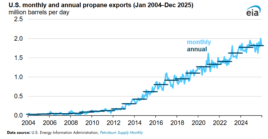 U.S. propane exports averaged a record 1.8 bpd in 2025, the most since the EIA began collecting this data in 1973. U.S. propane exports rose just 3% compared with the previous year. Propane is consumed globally for space heating, and it’s increasingly used as a petrochemical feedstock, especially in Asia, among other uses. Three of the top five destinations for U.S. propane exports are in Asia, including China, Japan, and Korea.