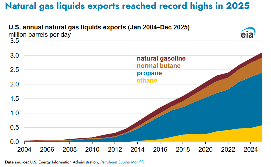Natural gas liquids (NGL) exports reached 3.1 MMbpd in 2025, growing 7% from the previous year. These fuels are primarily extracted from the natural gas stream. NGL plant production has increased every year since 2005, driven by higher production of NGLs and more global demand for NGLs, especially as petrochemical feedstocks.