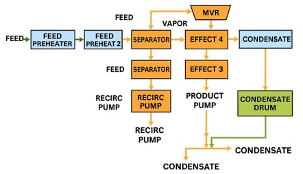 Evaporator package unit: Process description. The evaporator package (FIG. 2) depicts a simplified evaporation system designed to concentrate aqueous solutions by removing water in successive stages. The feed is first preheated through dedicated heat exchangers before entering the first effect, where partial vaporization takes place.