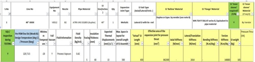 - Custom datasheets (FIG. 4) were provided to multiple vendors, specifying requirements that needed to be filled by expansion joint vendors (i.e., stiffness, actual overall length) based on layout limits. These yellow columns in FIG. 4 are vendor-fillable fields, meaning vendors must provide these details based on their design and manufacturing capabilities.