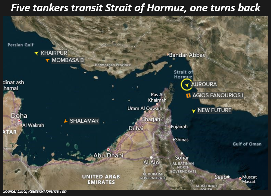 The tanker Auroura is laden with Iranian oil products while the New Future vessel is carrying diesel loaded from the Hamriyah port in the United Arab Emirates and is heading to Sohar, Oman, Kpler and LSEG data showed. Both are medium-range tankers carrying about 330,000 barrels of oil.