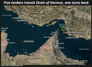 Malta-flagged VLCC Agios Fanourios I, which attempted to enter the Gulf on Sunday to load Iraqi Basra crude for Vietnam, has since turned back and is anchored near the Gulf of Oman, the data showed. The tanker plans to head to Iraq.